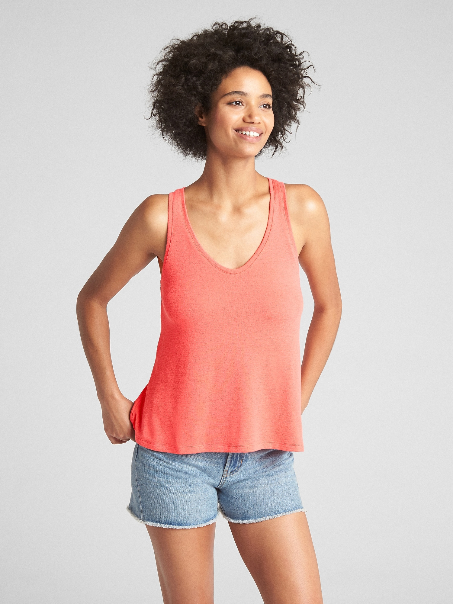 I like this very much. I think its high enough in the front to offer some support. I have a bigger chest so would also need to wear a sports bra, but I have to do that with all workout gear. I was a little surprised as to how big the cut out is in back.